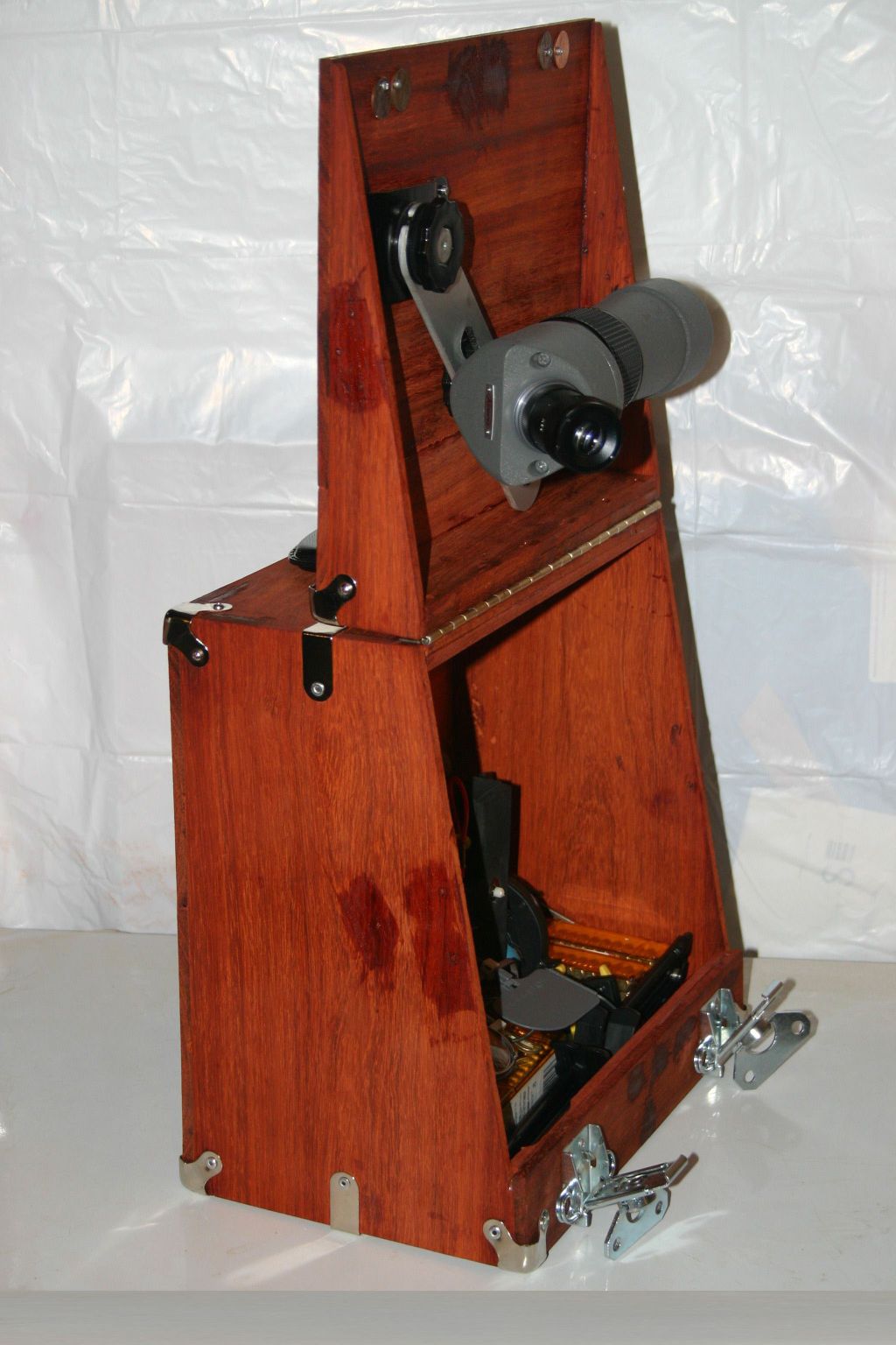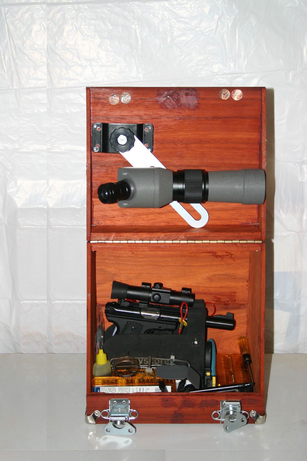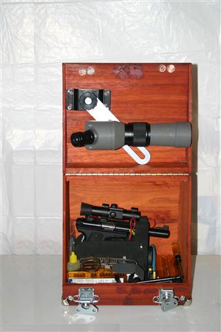 box to close with the scope still attached. Complete with mounting bracket and